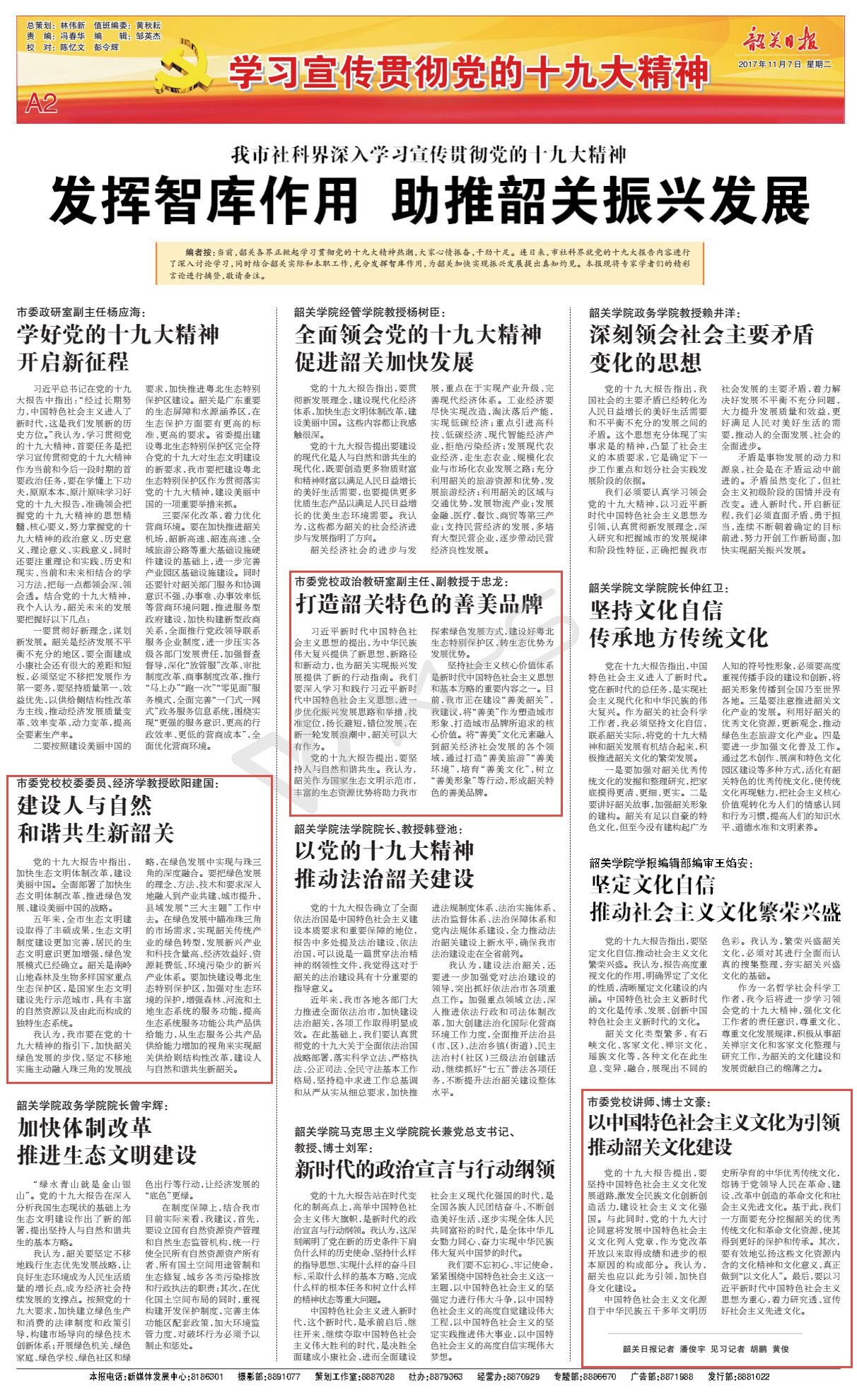 编者按:当前,韶关各界正掀起学习贯彻党的十九大精神热潮,大家心情振奋,干劲十足。连日来,市社科界就党的十九大报告内容进行了深入讨论学习,同时结合韶关实际和本职工作,充分发挥智库作用,为韶关加快实现振兴发展提出真知灼见。本报现将专家学者们的精彩言论进行摘登,敬请垂注。