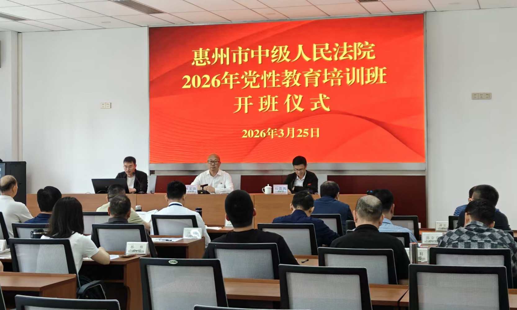 近日,惠州市中级人民法院2026年党性教育培训班在我院顺利举办。开班仪式上,惠州市中院机关党委专职副书记林宏治作开班讲话,强调党性修养是法院党员干部的立身之本、履职之魂,希望全体参训学员以此次培训为契机,深化理论武装、锤炼政治品格,自觉把党性要求融入司法履职全过程,始终坚守司法为民初心、践行公平正义使命,以更坚定的政治自觉、更务实的工作作风推动全市法院工作高质量发展。