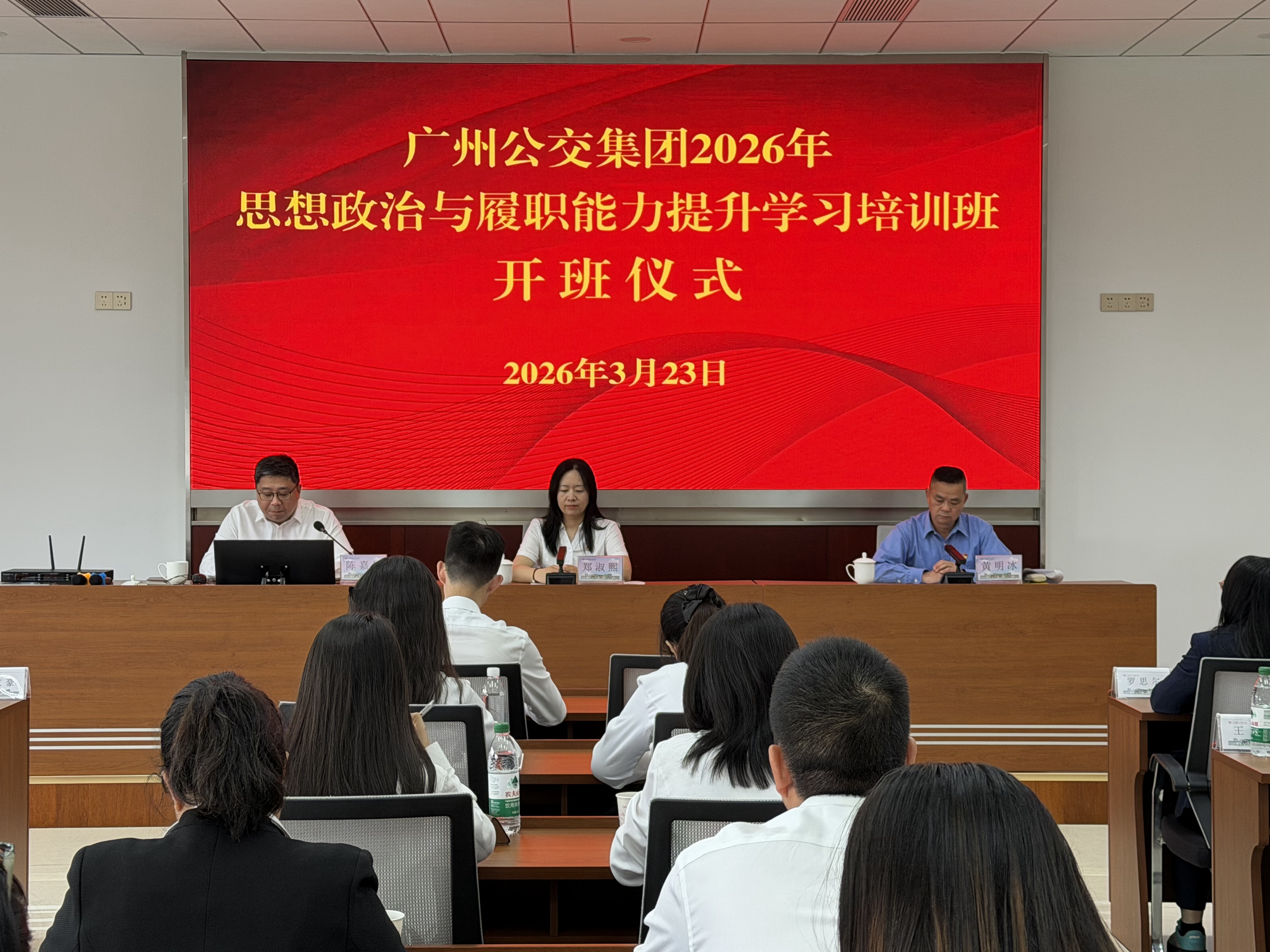 近日,广州公交集团在广东南岭干部学院举办2026年思想政治与履职能力提升学习培训班。开班仪式上,集团人力资源部副部长郑淑熙作动员讲话,充分肯定了集团在思想政治建设和服务民生保障方面取得的成效,希望参训学员进一步提高政治站位,强化理论武装,切实把学习成果转化为提升履职能力、服务市民出行的实际行动,充分发挥党员干部先锋模范作用,为广州公共交通事业高质量发展注入强劲动力。