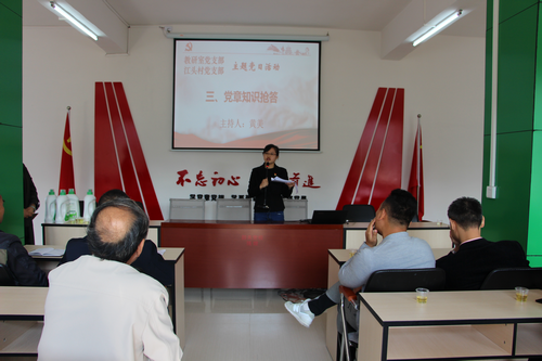 当日上午的活动主要有三项:一是举办一次座谈会。教研党支部党员来到江头村委会,与村支委会成员及部分老党员举行了座谈会,双方就各自在基层党组织建设方面的基本情况、主要经验和存在问题等进行了深入交流。二是听取一堂党课。由教研室党支部书记、田千山副教授为党员们宣讲《深入学习贯彻习近平总书记视察广东重要讲话精神》,课程主要从“总书记去了哪儿?”、“总书记说了什么?”和“总书记为什么说?”三个方面作出了深入浅出的讲解。三是进行一次知识抢答竞赛。由教研室党支部支委黄美老师主持,知识竞赛围绕学习习近平新时代中国特色社会主义思想和党的十九大精神展开,重点学习十九大新修改党章,双方党员积极参与抢答,活动气氛十分活跃。