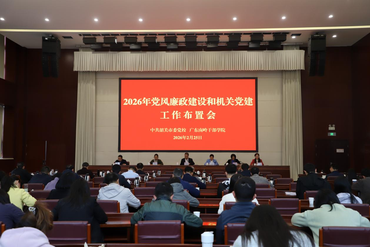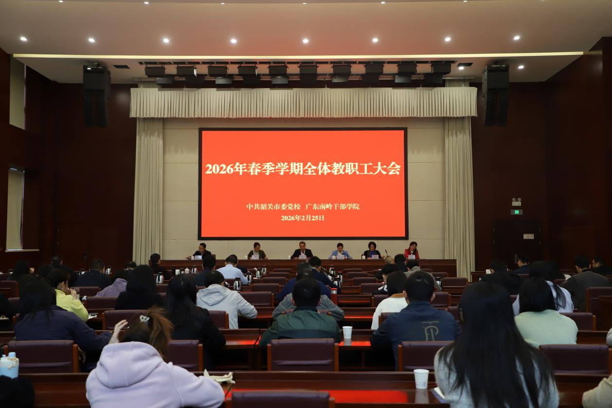2026年2月25日上午,市委党校(广东南岭干部学院)召开2026年春季学期教职工大会,传达学习韶关市“两会”精神、十三届韶关市纪委六次全会精神和《整治形式主义为基层减负若干规定》,通报中组部关于广东南岭干部学院办学质量评估的反馈意见,专题部署2026年党风廉政建设和机关党建工作,总结2025年工作并布置2026年重点工作任务。常务副校(院)长雷能福主持会议,全体教职工参加。