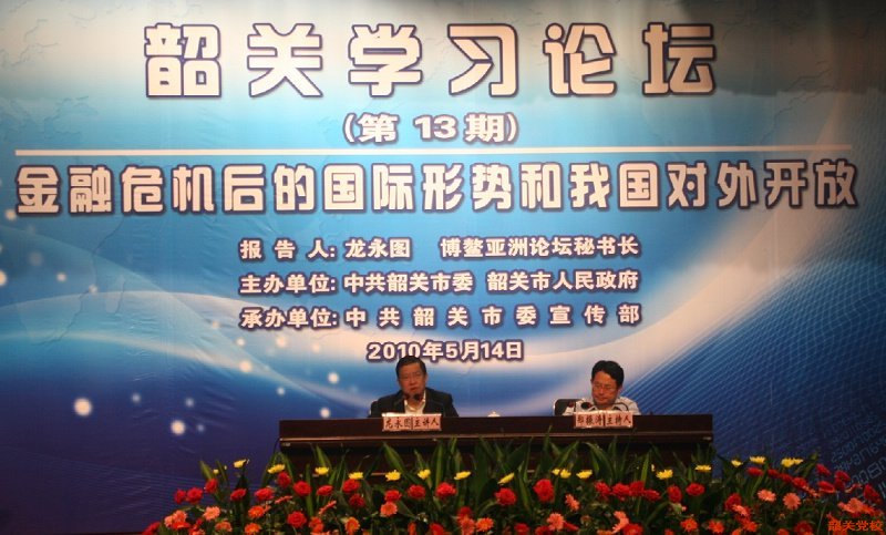 郑振涛指出,龙永图从经济全球化的角度和国家战略的高度,立足虚拟经济领域和实体经济领域,为我们深入分析了金融危机后的国际形势和新形势下所面临的新挑战和新机遇,以及因应这些挑战和机遇而调整的发展战略和对外政策。为全面深入贯彻落实科学发展观,为我市加快转变经济发展方式提供了重要的启示,帮助我市领导干部进一步认清金融危机后的国际形势和我国的对外开放趋势,开拓国际视野、强化战略思维,切实打好转变经济发展方式、提高"双转移"质量、推进扶贫开发"规划到户、责任到人"工作"三场硬仗",推动韶关科学发展、跨越发展。