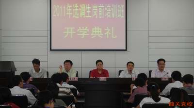 7月4日,2011年选调生岗前培训班开学典礼在韶关市委党校举行,市委组织部副部长李志斌,韶关市委党校常务副校长孔庆红,市委组织部干部综合科科长李湘柱,市委组织部干部培训科科长叶济熊等出席了开学典礼,开学典礼由韶关市委党校副校长杨斌主持。