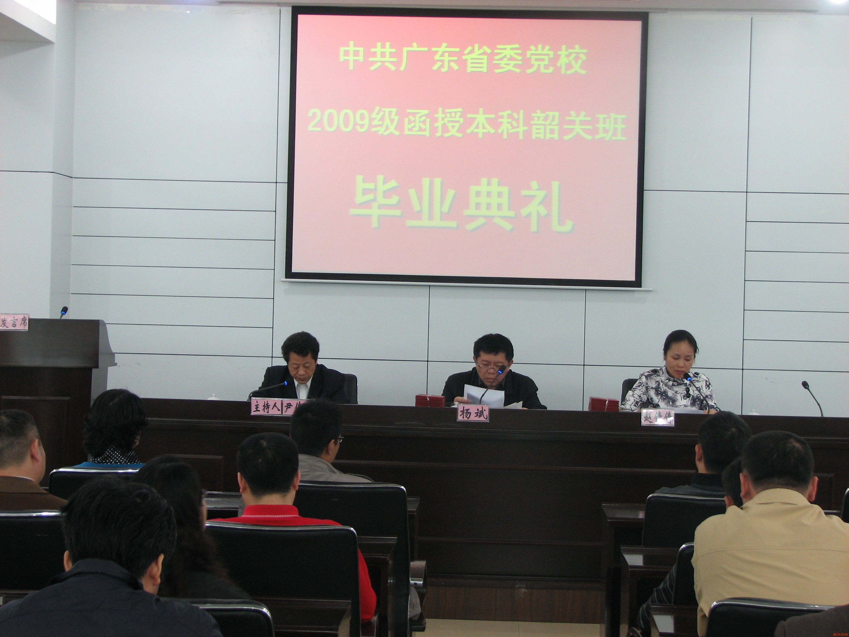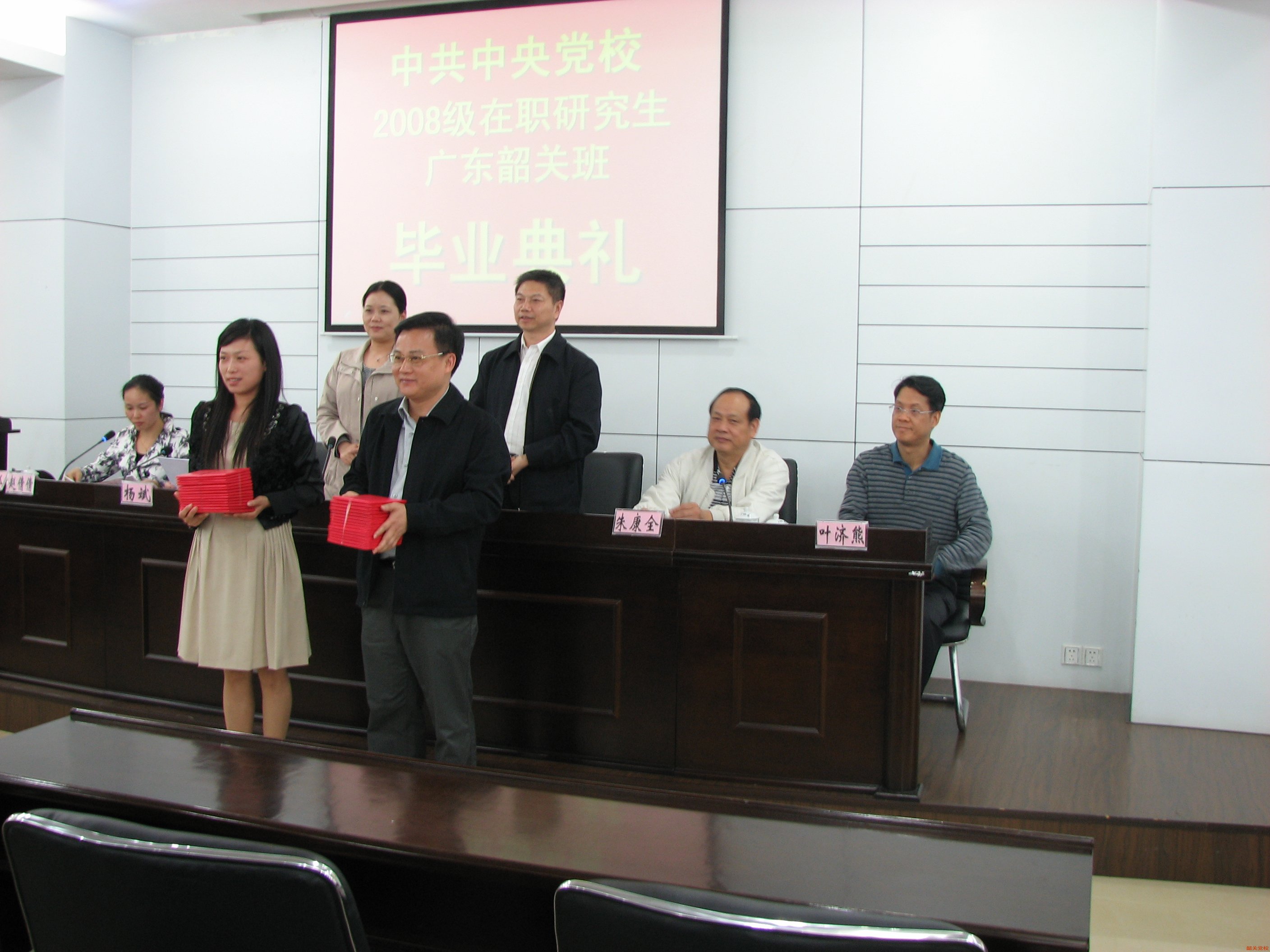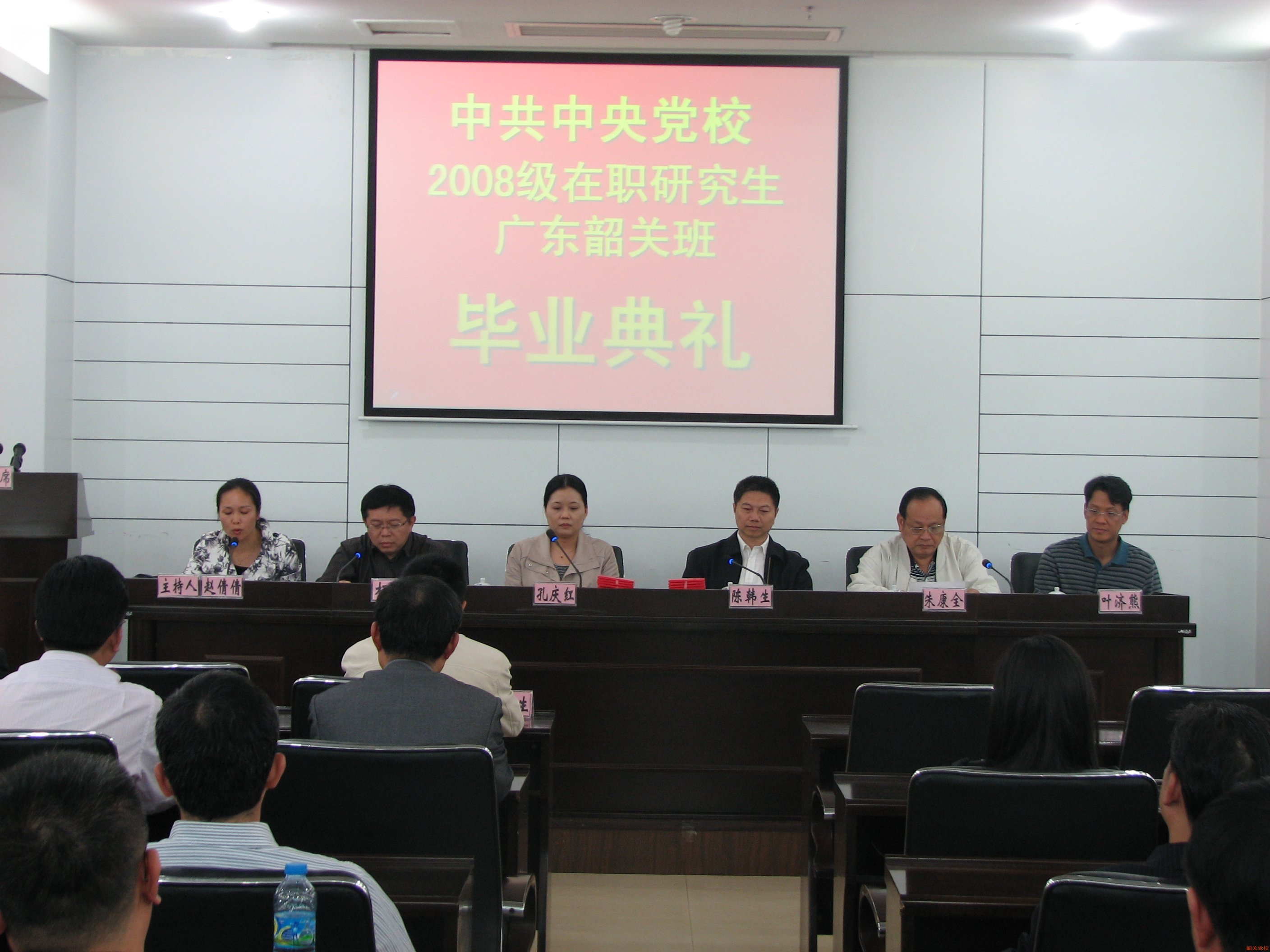 中央党校2008级在职研究生韶关教学班和省委党校2009级函授本科韶关市直班近日在我校举行了毕业典礼。省委党校副校长陈韩生、函授学院院长朱康全、市委党校常务副校长孔庆红、副校长杨斌、校务委员赵倩倩、市委组织部培训科长叶济熊等到会祝贺。
